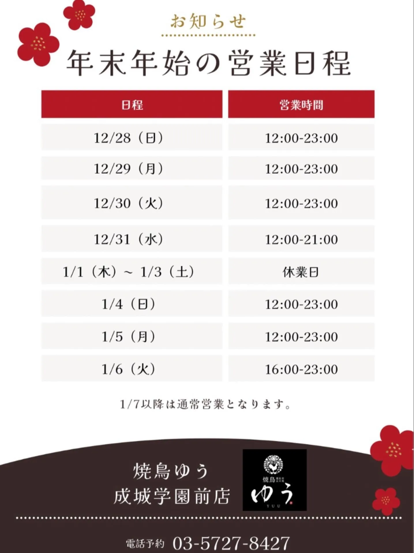 【年末年始の営業についてのお知らせ】